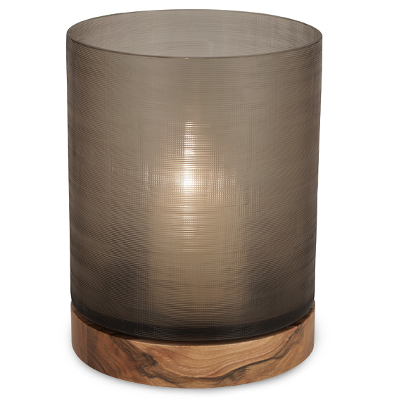 Minimalistisch und schlicht ist das gekonnte Design des Windlichts Aran, das eine wunderbare Atmosphäre erzeugt. Dafür sorgen sowohl das rauchzarte Glas als auch der aufwendig Handschliff. Der Holzfuß ist hochwertig aus Walnussholz gefertigt.