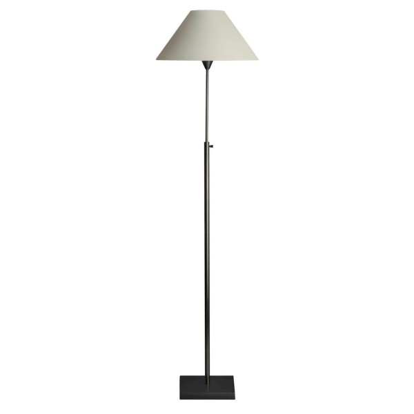 Hier abgebildet mit einem schlichten zylindrischen Schirm. Diese Bodenleuchte ist durch einen Teleskopversteller variabel, so dass sie auf die gewünschte Höhe eingestellt werden kann..